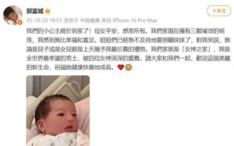 2025日傍晚,方媛突然在微博上发了一组照片,抱着刚满月的三胎女儿,窗外就是香港维多利亚港的迷人景色,阳光轻轻撒进屋里,整体氛围温馨得像电视剧中的场景一样。